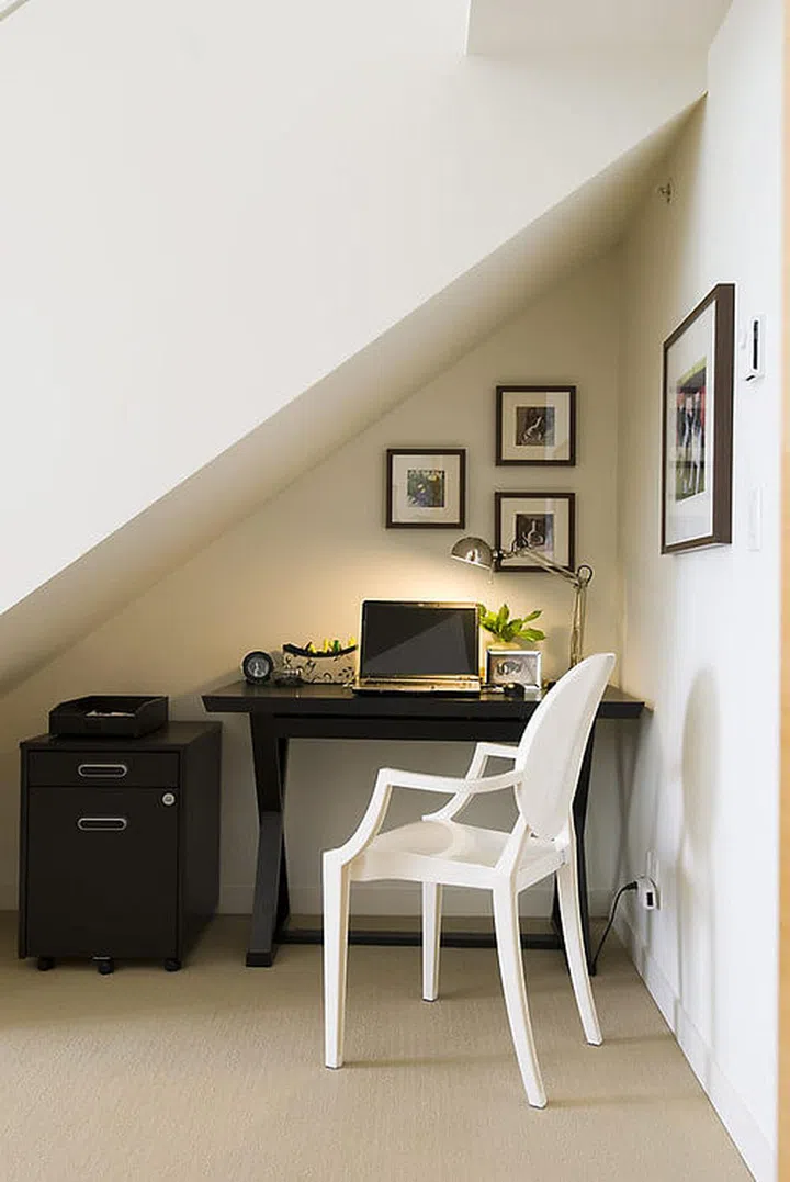 Dead space under a flight of stairs can also house a cosy home office corner. Just be sure that the sloping ceiling is not low enough to be a hazard when you get up from the chair!