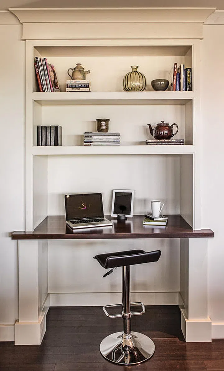Besides turning a nook into an open display shelf, you can also fit in a larger ledge for it to double up as a compact work desk.