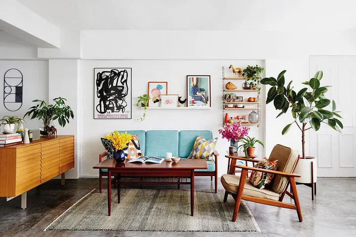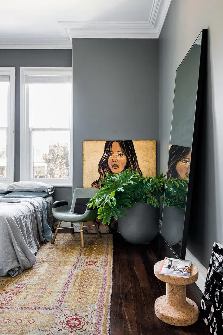 An oversized pot, mirror and painting creates a nice little vignette for this simple bedroom.