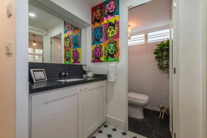 Add colour to your all-white bathroom with a piece of art. This homeowner chose a pop-art rendition of Marilyn Monroe!