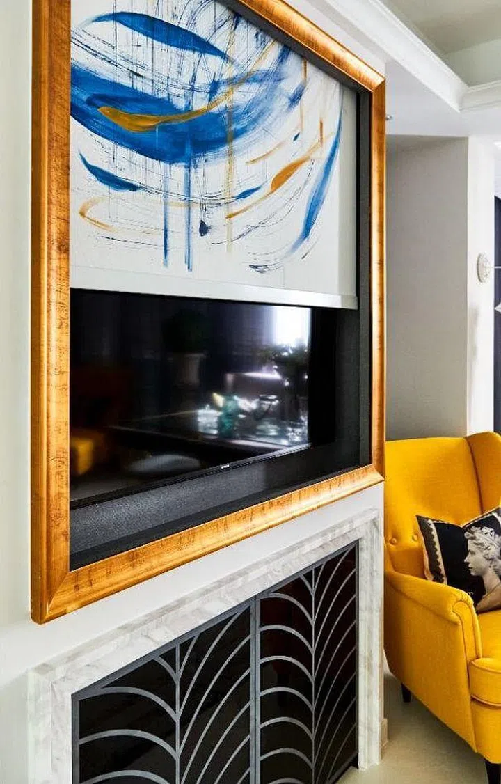 It may look like an art piece, but this wall feature also hides the television when it is not in use.