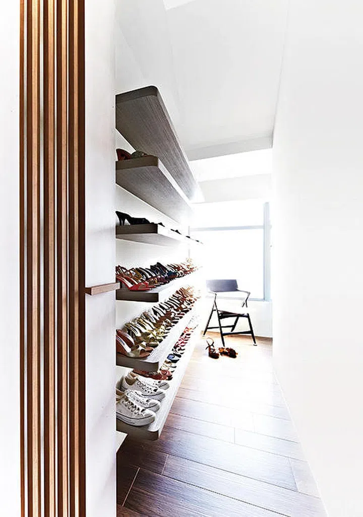Imagine converting a wall that separates two areas into a large swivel door to hide the wall-to-wall shelf behind it. It's a great idea for an open-concept home design and works well when you want to separate a sleeping space from the work space for example.