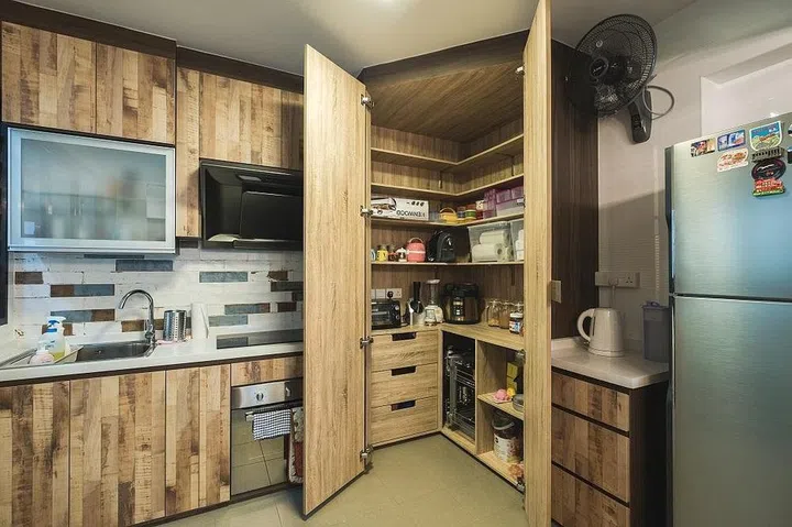 To create ample storage in the kitchen, the designers built a concealed corner unit to accomodate their many utensils. This keeps the countertops clutter-free without compromising on countertop space.