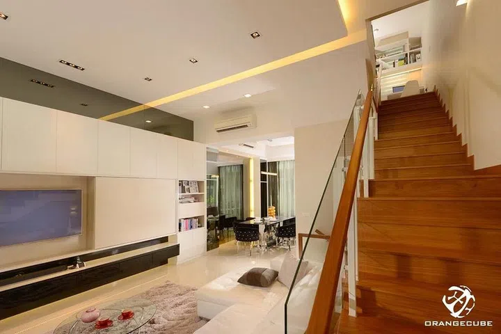 Customised built-in fixtures in this spacious house keep it looking sleek and neat. This modern contemporary house in Yio Chu Kang boasts an open plan interior design.