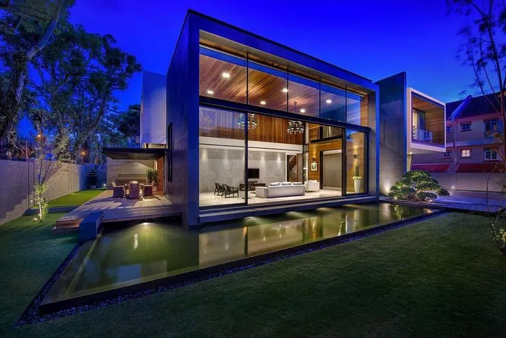 The architect team for this house decided to give the home an entirely new look with rustic elements. This was achieved through the use of warm, natural materials, such as wooden decking and swivelling wooden screens.