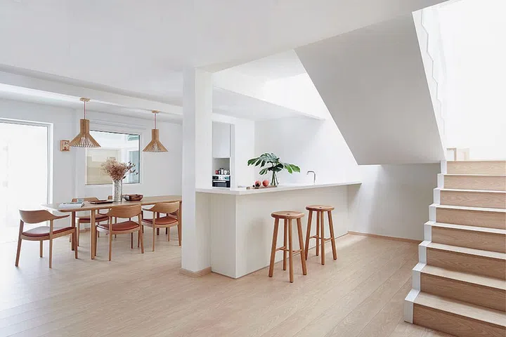 This penthouse apartment at Yio Chu Kang (pictured above) is home a couple in their 30s and their two young children. The couple opted for pared-down decor and wood and concrete interior design.