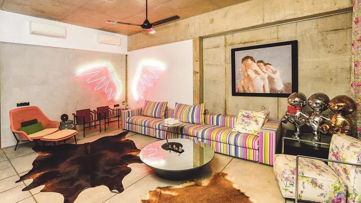 In the living room, the floral curtains are paired with a striped sofa in shades of pink, purple and green. In the corner of this room, there is a bespoke neon light installation of a pair of angel wings, which are lit up when there are guests.