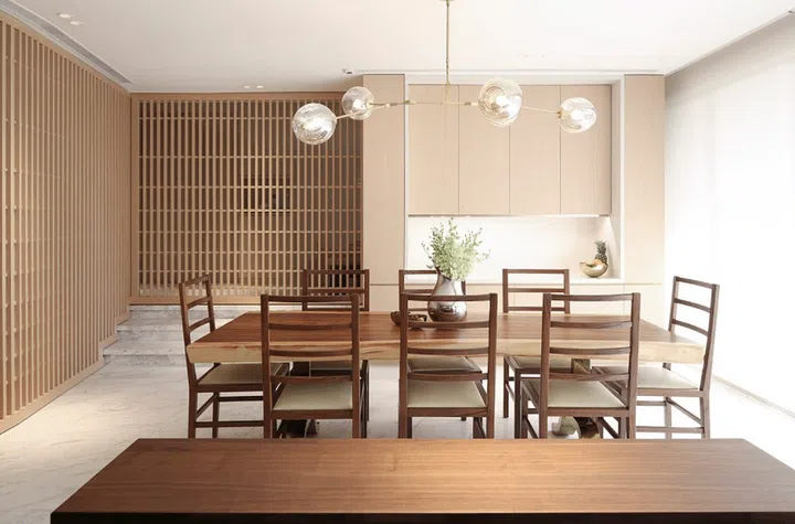 Sliding wooden screens are used to segment the spaces, acting as doors to close off the areas when necessary.
