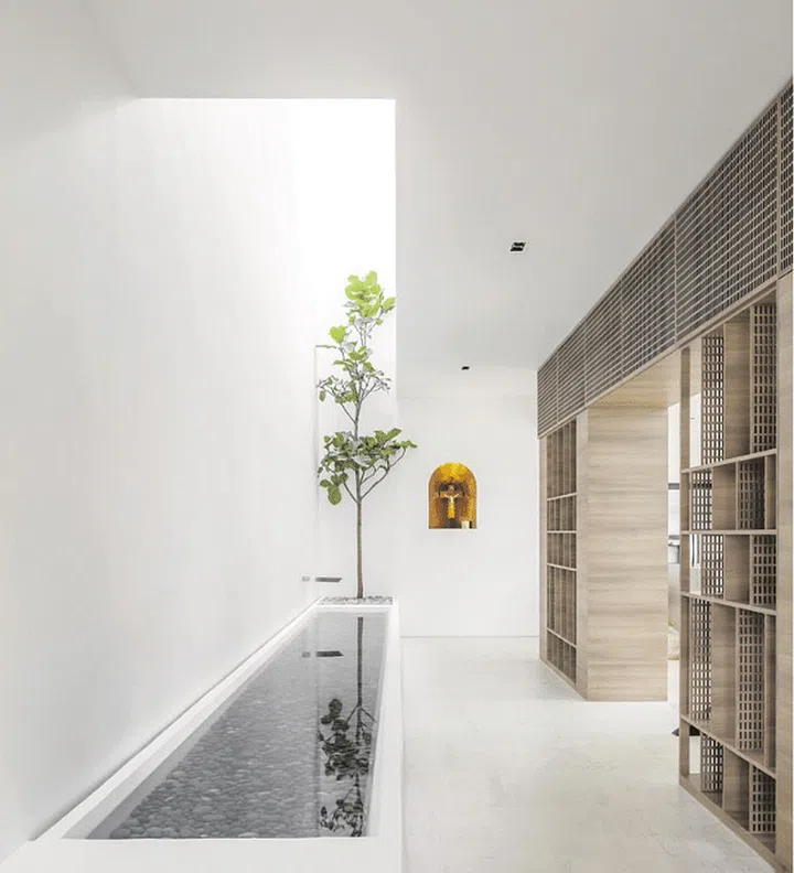 Mr Lim designed a tranquil prayer space for the family altar, with a calming water trough adjacent to the altar. A wooden bookshelf separates the double-volume living room from the prayer area.