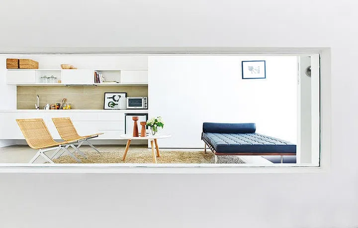 To maximise the room's limited footprint, the designers build storage into the floors with the help of a platform bed, which also works as a decorative element in itself. Having a white built-in cupboard against a white wall also allows this chunky feature recede into the background, making it easier on the eyes.