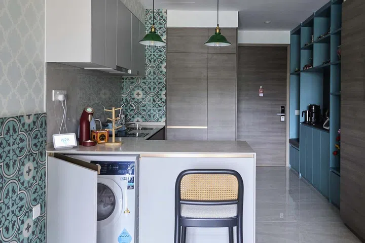 On the other side of the entrance is the open kitchen with an L-shaped configuration that makes efficient use of limited space with plenty of built-in both above and under the counter. Wall tiles in different Peranakan motifs reinforce the theme. Interior designer Don kept the colour palette to a green-turquoise combination that provides a striking composition without competing with the intricate designs of the tiles.