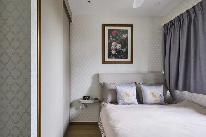 Different coloured wallpaper in a similar pattern help to establish a common thread. As with the living room, due to the compact size of the bedrooms, Don was mindful in designing built-in shelves and cabinets that are slim and shallow so as not to encroach too much into the bedroom space or compromise on the circulation area.