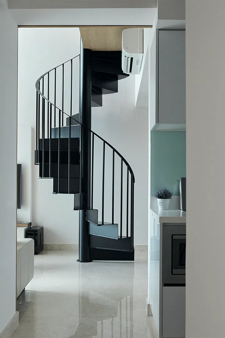 The black spiral staircase makes a strong visual statement in the home. “As the rest of the home is in a lighter hue, I chose a matte black finish for the staircase for contrast,” explains Keave.