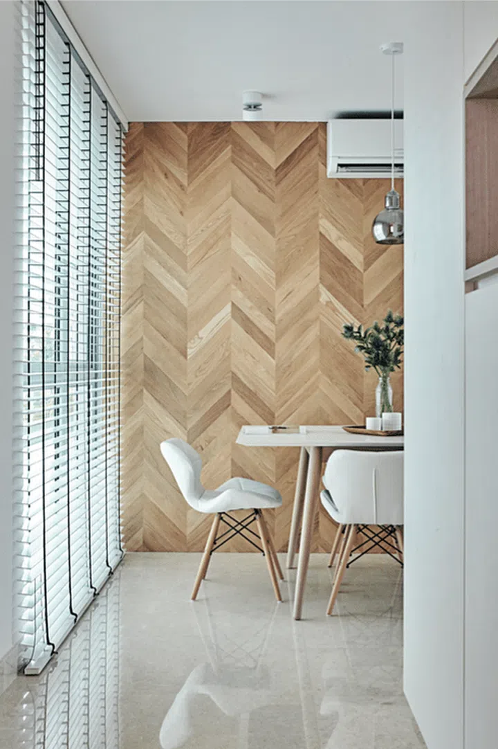 For a liveable and cosy abode, designer, Keave Lim of Eightytwo clad the walls throughout the living and dining area with strips of solid honey-hued white oak placed in a herringbone pattern.