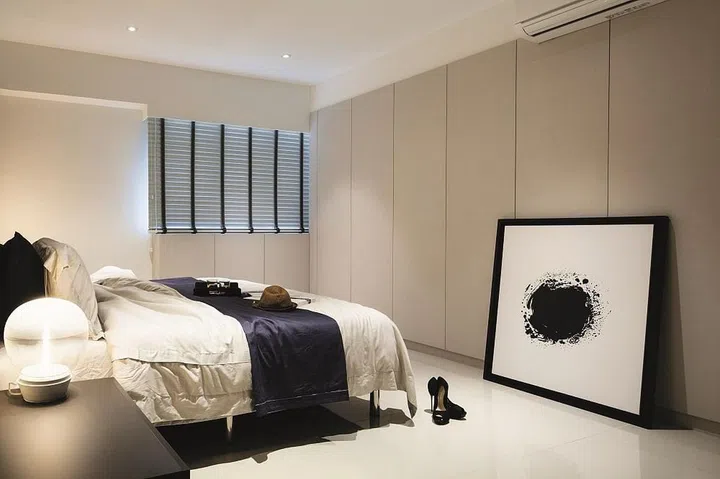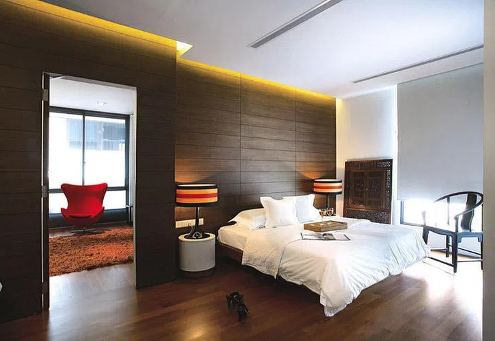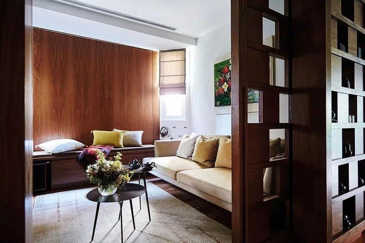 For a timeless look, an earthy palette was used for the apartment, from the spray painted white joinery and Canadian walnut-clad open shelves to the fabric feature wall in the master bedroom. The latter opens up to more storage space.
