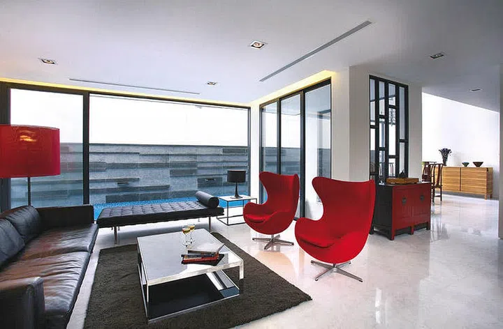 This contemporary home by Renaissance Planners & Designers uses pops of red to brighten up the neutral-hued home.