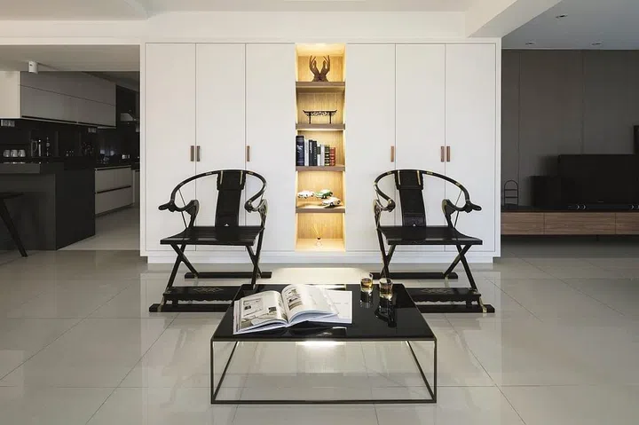 Besides display and storage units, marble flooring throughout the home give it an elegant and luxurious appeal, and designer furniture pieces in light and earthy tones create a welcoming ambience. The customised dining table is paired with chairs by Patricia Urquiola from Space Furniture.