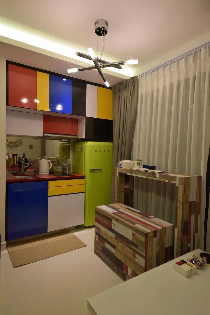 To make the home look bigger, he opted for marble flooring and walls in white. Pops of colour come in the form of furnishings, such as an orange sofa and a lime-green Smeg fridge.