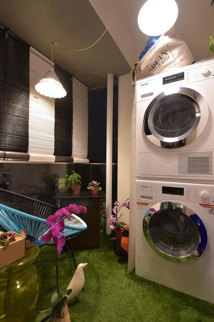 Greenery can also be found in the balcony, tucked away in a corner of the bedroom and partitioned from the sleeping area by a glass door. Here, the floor is carpeted with fake lawn grass and the space decorated with potted plants. The washing machine and dryer are placed there. “I get good views of the sunrise from the balcony,” says Mr Ng. “I would like to have a cup of coffee here more often.”