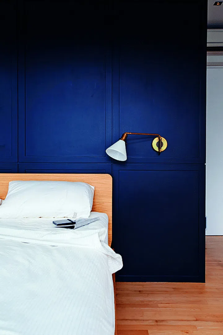Designed by architect William Ng from Studio Wills + Architects, the dark blue shade of the kitchen area complements the warm tones of the living room, which was left in its original state.