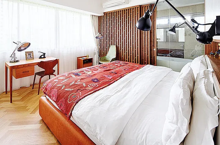 In the master bedroom, oak flooring in a herringbone pattern introduces warmth, while sliding timber screens either allow more light into the en-suite bathroom or provide privacy.