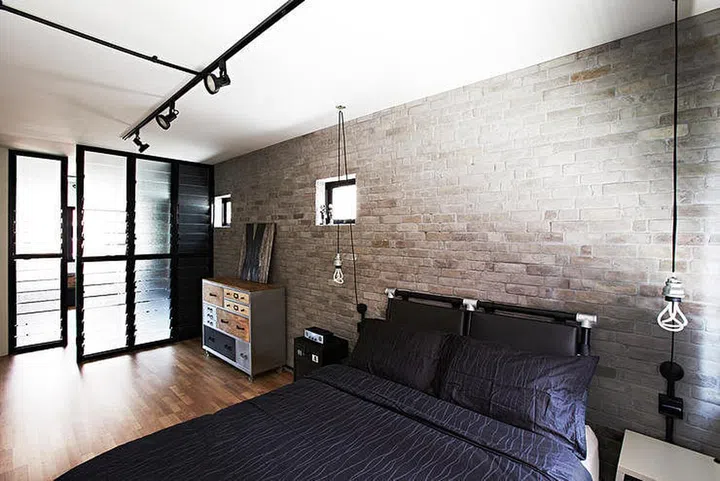 To keep to the industrial look in the home, the bedroom was kept bare in order to make the concrete brick wall stand out.