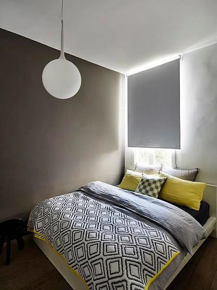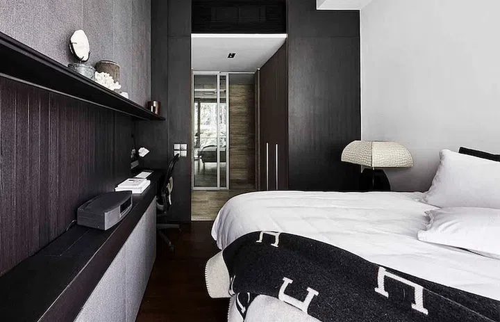 This 441sqf condominium apartment in the west exudes a chic hotel-room atmosphere, and can accomodate a queen-size bed as well as enough storage space for the owner's bulky sports gear.