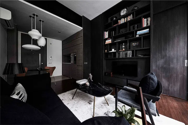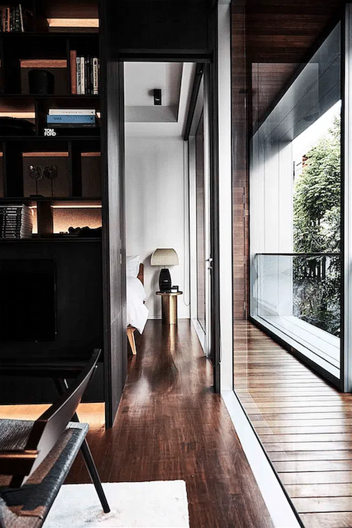 Designed by Akihaus, it features folding glass doors with black aluminium frames separates the living room from the bedroom.