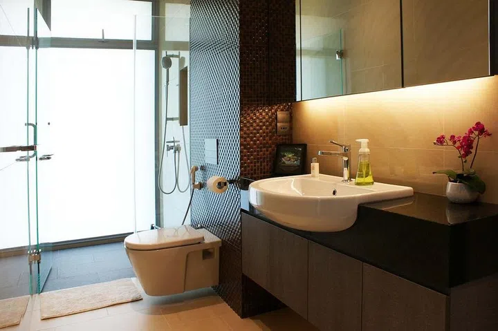 To illuminate this dark, yet cosy and warm bathroom in this three-bedroom condo home, a low hanging pendant light is added.