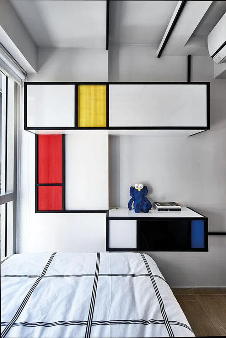 Besides the simple, subtly textured, surfaces seen around the flat, the team from Free Space Intent also designed the built-in carpentry to have an eye-catching geometric look.