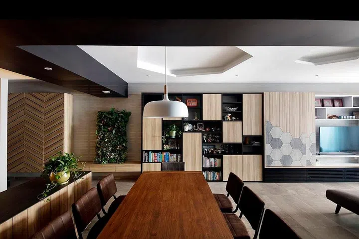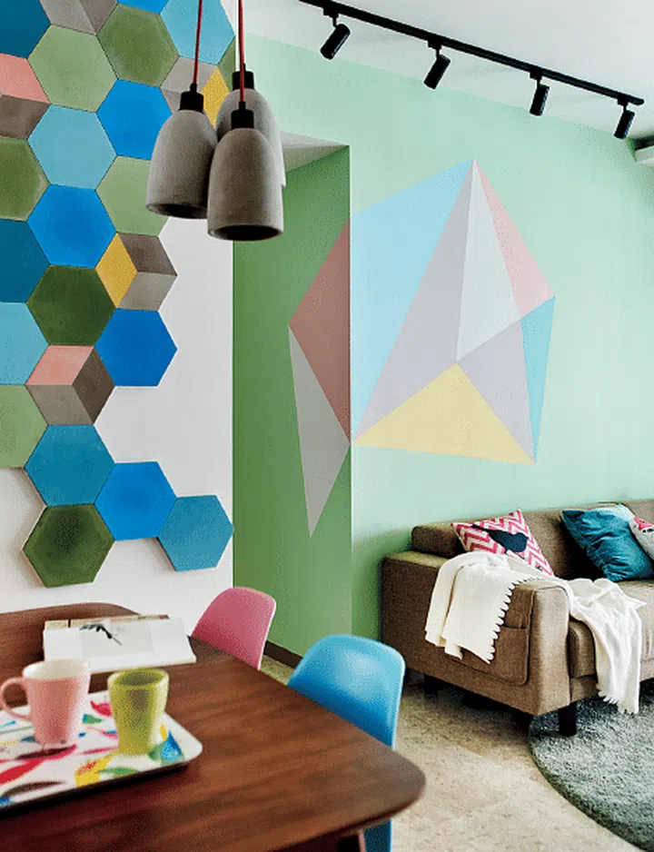 Interior designer Raymond Seow thought of different ways to achieve geometry throughout the home; he chose to paint geometric motif on the walls and lay hexagonal tiles for the indoor dining area.