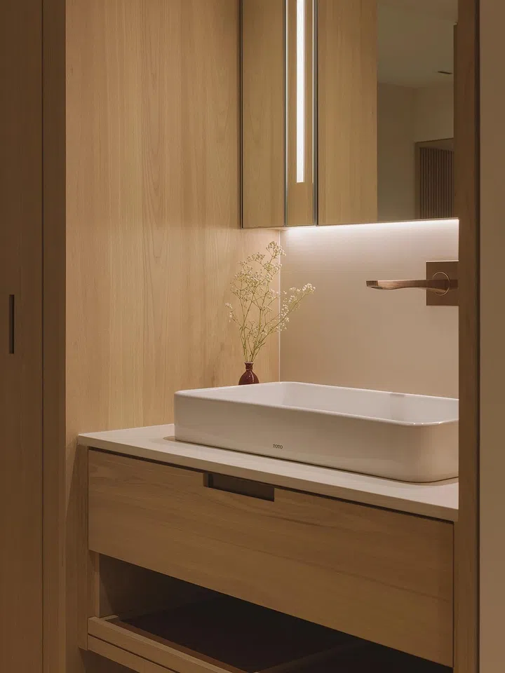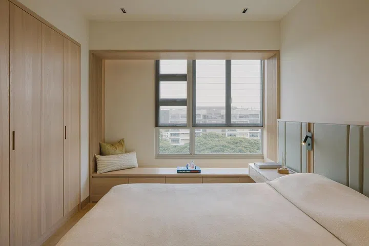 The pastel colour palette evokes a soothing ambience. A bay window incorporates storage underneath. It is enveloped by a wooden frame all round that reinforces the Japanese theme. This spot by the window resembles a Japanese teahouse and is perfect for relaxing over a cup of matcha and a book.