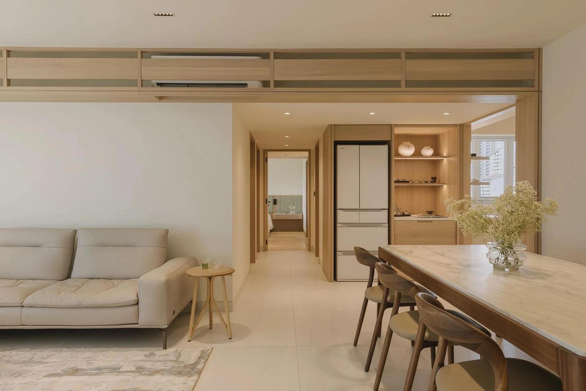 As the couple hosts cell group meetings in their home, the living room has been kept spacious and open for this purpose. A wood panelling frame around the living room windows give off a Japandi vibe.