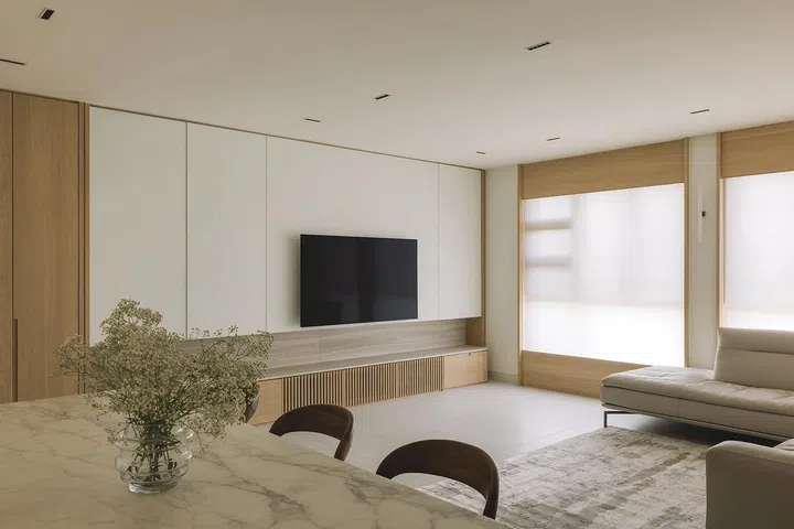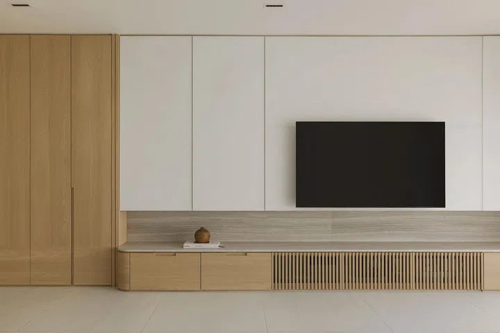 A full-height, built-in shoe cabinet next to the main entrance extends all the way across the living room as a television feature wall to achieve a seamless look.