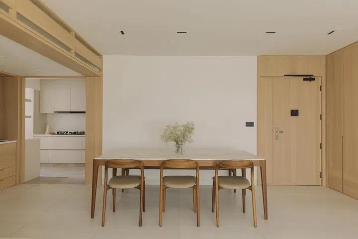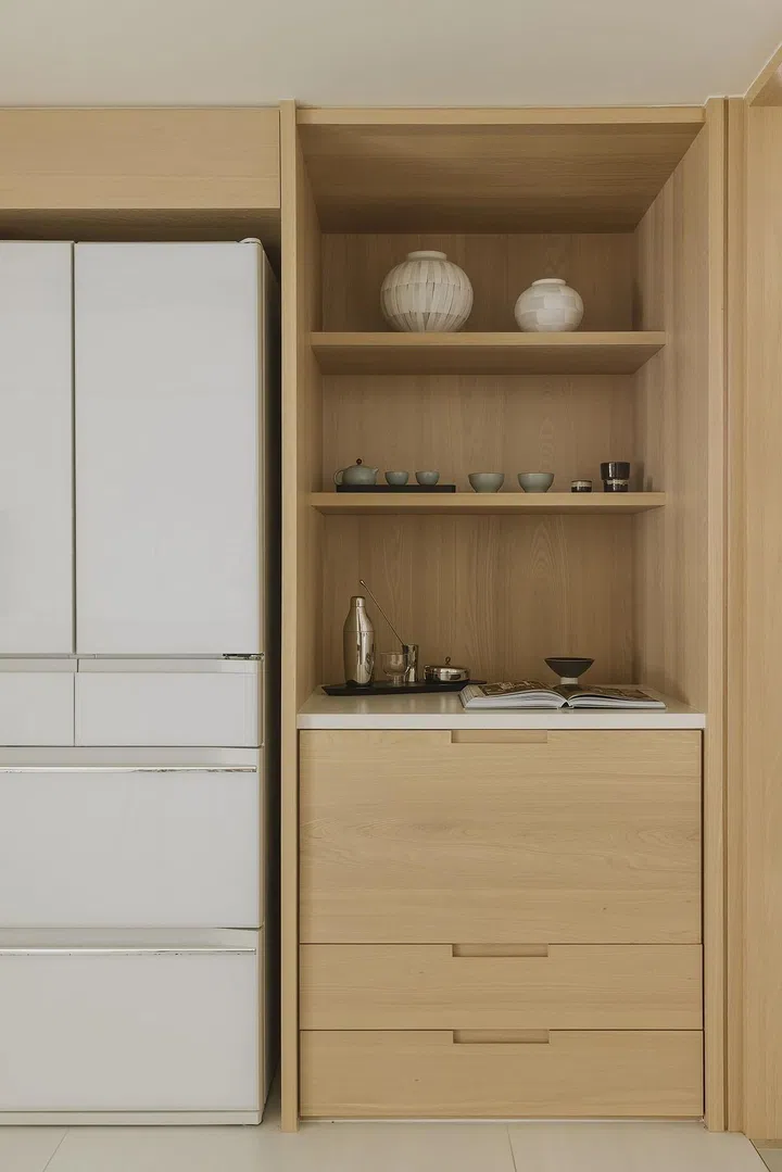 Outside the existing kitchen, just next to the dining area, interior designers Molina and Xin Fang introduced a dry pantry that houses the refrigerator. This is also where the homeowners can display and store their tea sets and coffee machine.