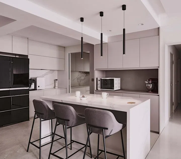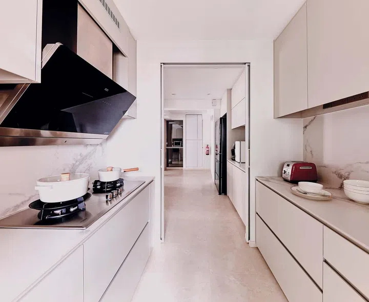 The island also doubles up as the family’s dining table, which was one of the reasons why the island was kept at a lower height, same as the kitchen counters, according to the homeowners’ preference.