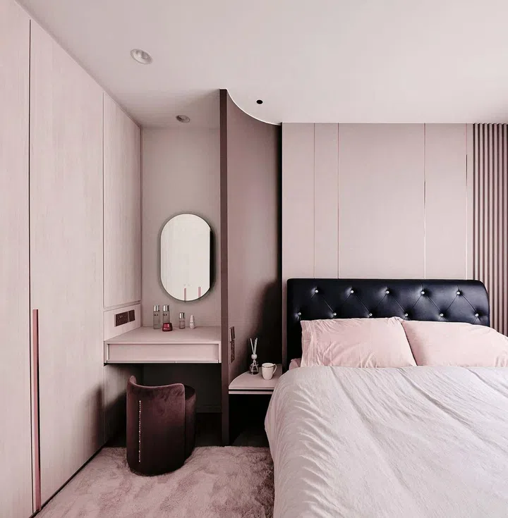 In the master bedroom, the focus was on creating a softer effect that complements the room’s function. The fluted headboard with gold inlay and a curved divider between the bed and the vanity area sets a restful mood.