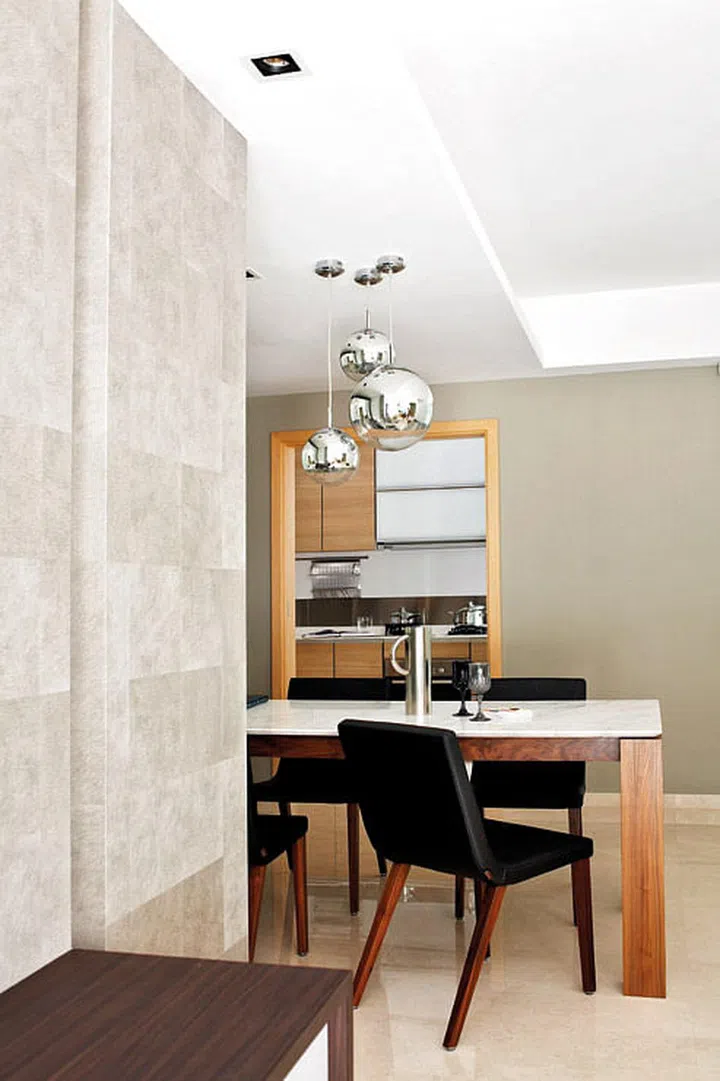 The dining area presents a masterclass in lighting design, where convention gives way to creativity. Rather than settling for a single statement piece, the designer orchestrated a symphony of three pendant lamps, each varying in length and size. This thoughtful arrangement not only illuminates the space but creates a dynamic visual composition that draws the eye upward, celebrating the maisonette’s generous ceiling height.