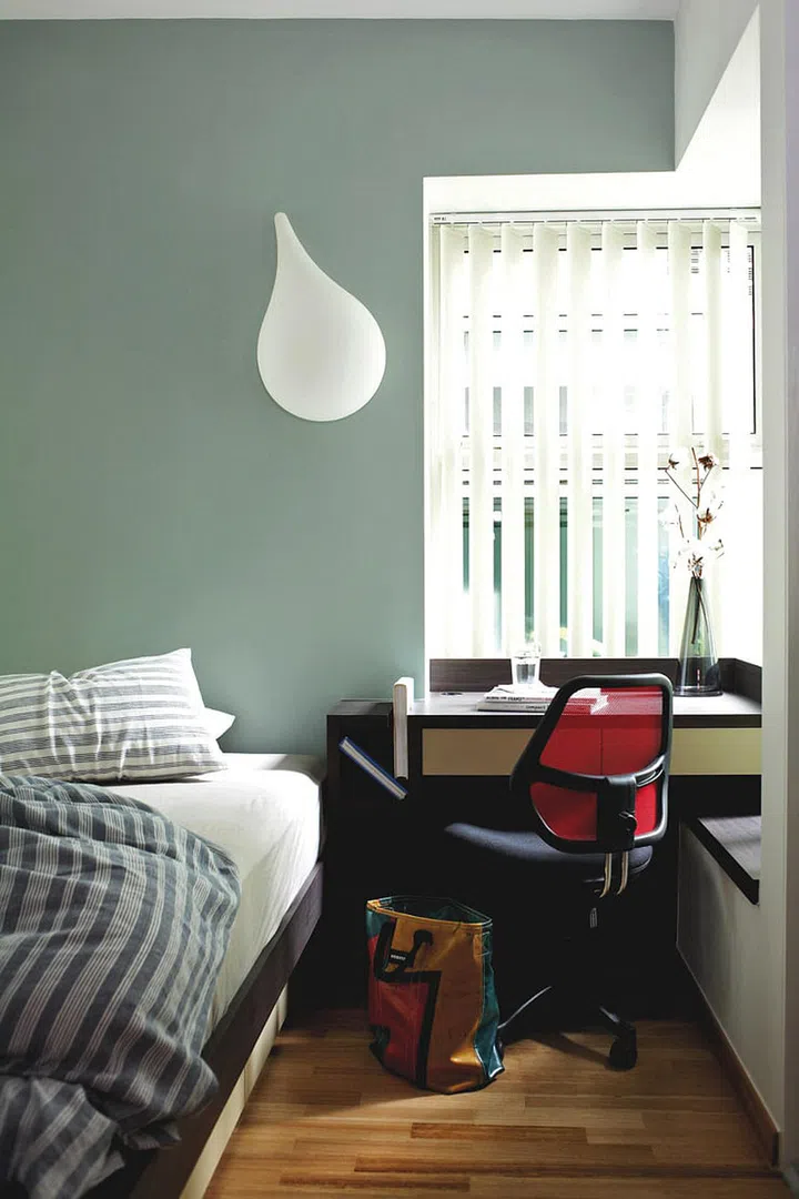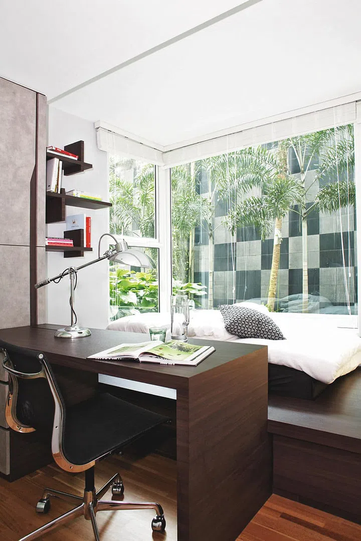 The son’s bedroom perhaps best exemplifies the innovative approach to maisonette interior design employed throughout this home. A raised platform serves multiple purposes – providing enhanced views of the surrounding greenery while cleverly incorporating additional storage space. This multi-functional solution speaks to the overall design philosophy of the home, where every element serves both practical and aesthetic purposes.