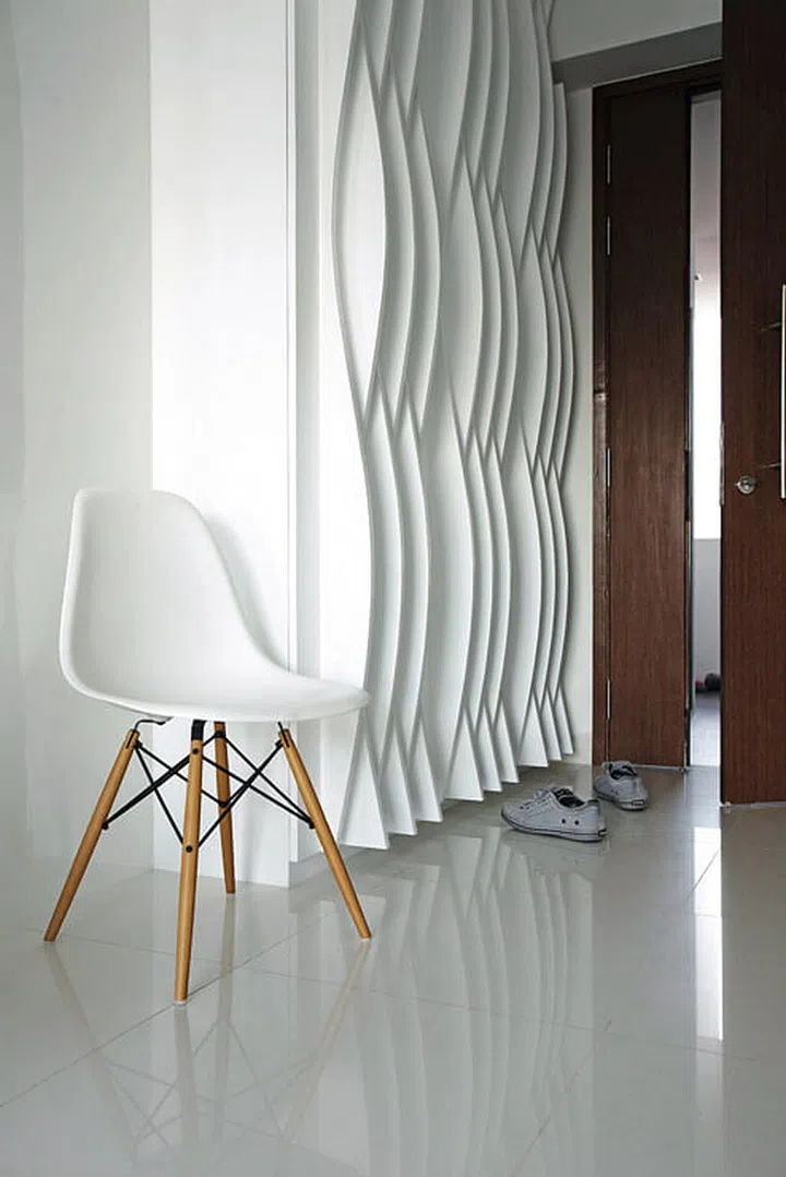 The monochromatic hues of this home allows its many three dimensional feature walls to co-exist stylishly