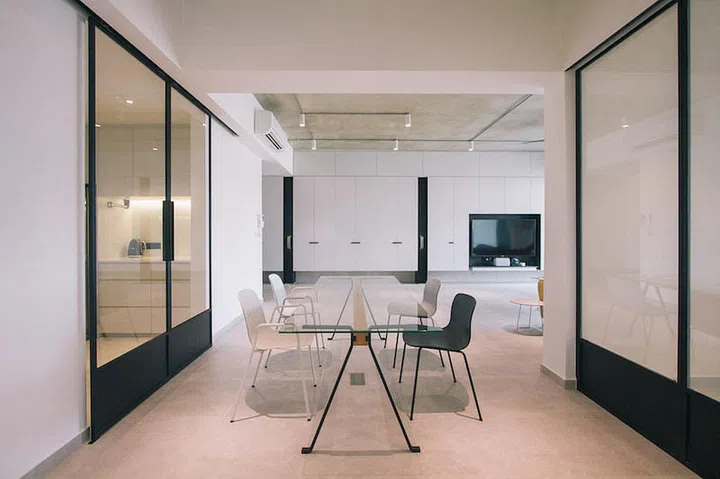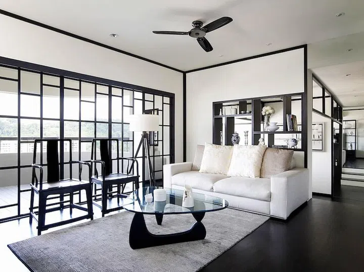 Think Chinese-style interiors, and what comes to mind are warm natural colours or bold, bright palettes. This apartment, however, redefines Chinese design elements with white surfaces and black-stained timber details.