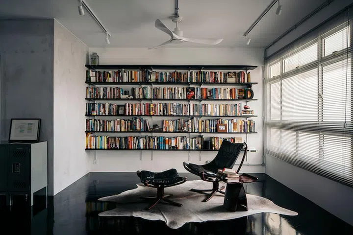 The main idea was also to keep the focus on the bookshelves and lounge chair in the middle of the space. To achieve that, the design team at Three-D Conceptwerke selected fixtures such as track lighting and ceiling fan in white. Industrial touches were added by way of metallic fixtures.