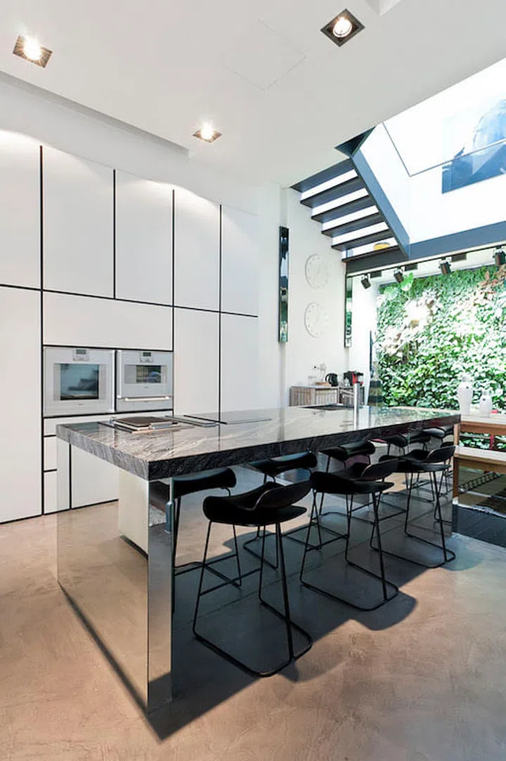 This terrace house’s living area features a massive wall of storage units finished in matte white and black. The slim lines form a grid that accentuates the size of this wall. Architology then incorporated open shelves in contrasting colours to serve as a transition from the living area to the dining area and open kitchen. The matte surfaces bring depth by diffusing the light that falls on them.