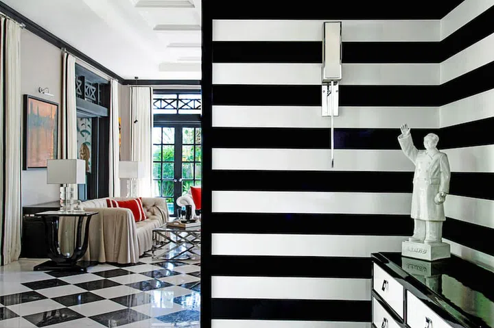 One way to go bold with this basic palette is to embrace patterns in a big way. Here, Design Intervention introduced timeless patterns in black and white, such that the classic monochrome takes on new life. Bold black and white stripes on the wall are matched with traditional chequered flooring in this bungalow.