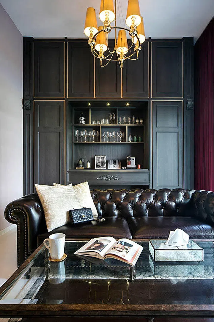 This living room exudes a gentleman's club vibe thanks to the tufted chesterfield sofa and bar feature!