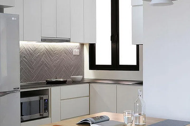 To add a visual effect in the otherwise plain kitchen interiors, the interior design team chose a material that gave the backsplash a textural finish.