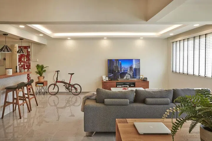 The homeowners of this 1,300 sq ft 5-room HDB flat in Bishan decided to give their apartment a makeover. They got interior designer Raymond Seow of Free Space Intent to streamline the layout and re-prioritise the spaces so that the home now boasts clean lines and is more spacious and light-filled.
