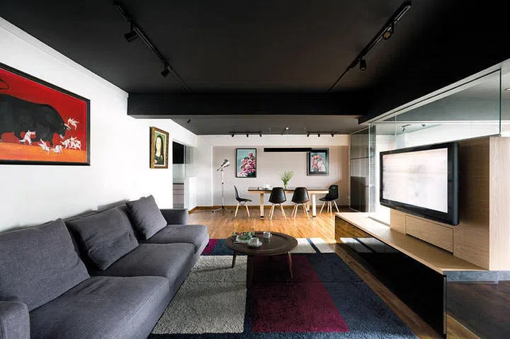 The white walls, dark engineered wood flooring and exposed ceiling beams in the living room of this 4-room HDB in Bishan reflect the homeownersʼ love for the colonial black-and-white style.