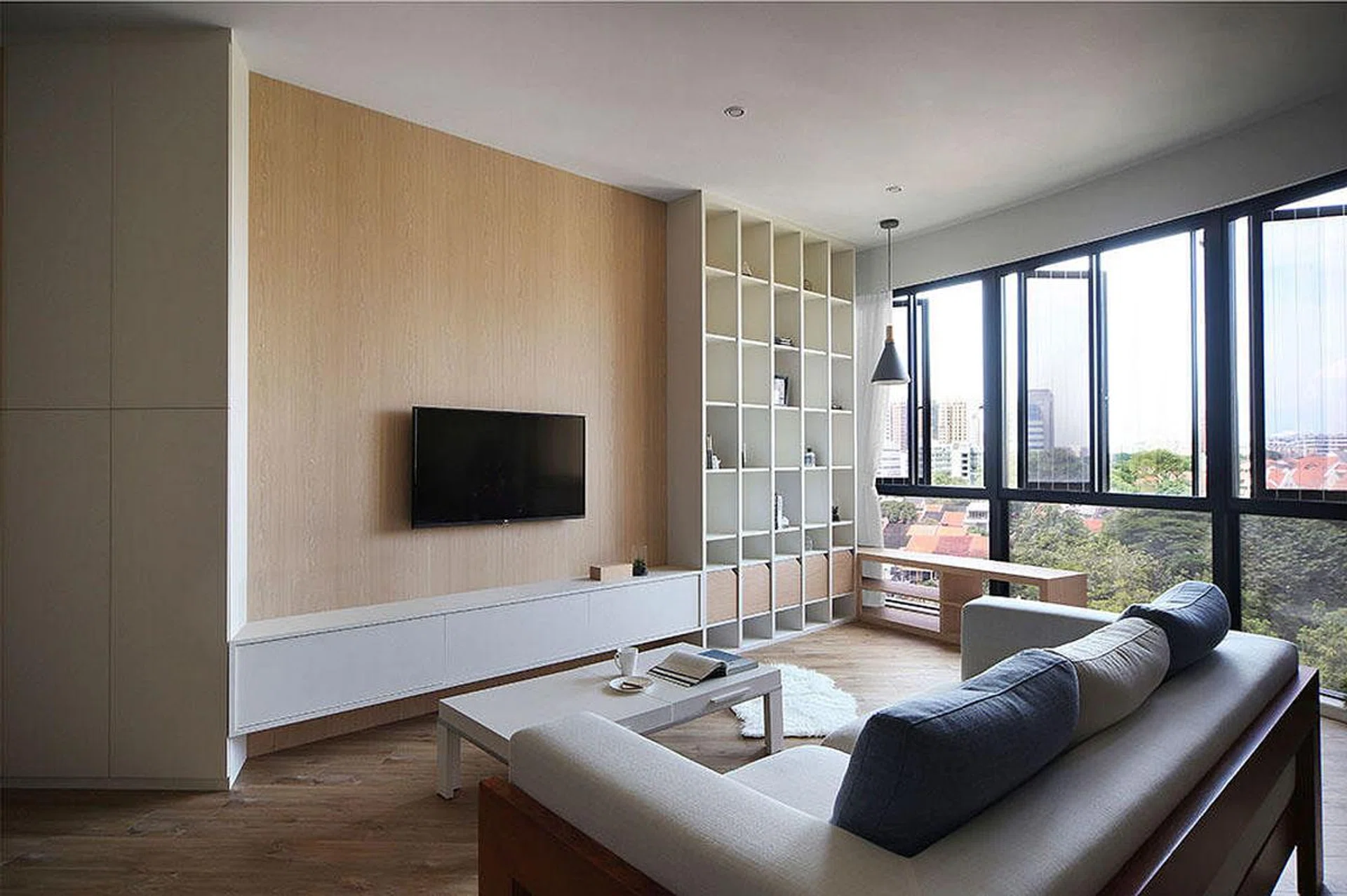 A wood-look finish clads the TV console area. The interior design team at 82 customised full-height wall shelves to offer display and storage space for the homeowners, to keep the home neat and clutter-free.