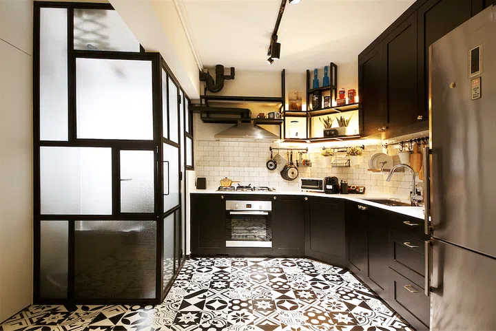 The monochrome theme is evident in the kitchen, with the use of black-and-white imported Peranakan floor tiles, black veneer cabinets with gold handles and black steel open racks mounted against a backsplash of white subway tiles.